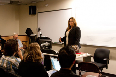 Valdes-Rodriguez visits liberal arts professor Peter Gardner's Fiction and Film class during her Berklee visit. Throughout the week, she visited several classes.