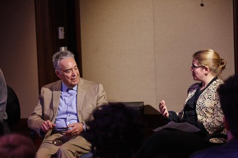 Howard Shore speaks with Alison Plante, assistant chair of the Film Scoring Department, during a panel discussion the day after the concert.