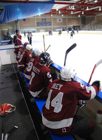 The Berklee IceCats cheer on their teamates at a game against the Boston Brawlers.