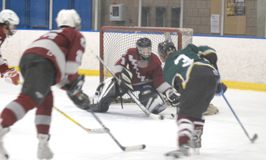 The IceCats stop another puck as the Boston Brawlers, a local men's league team, attempt to score.