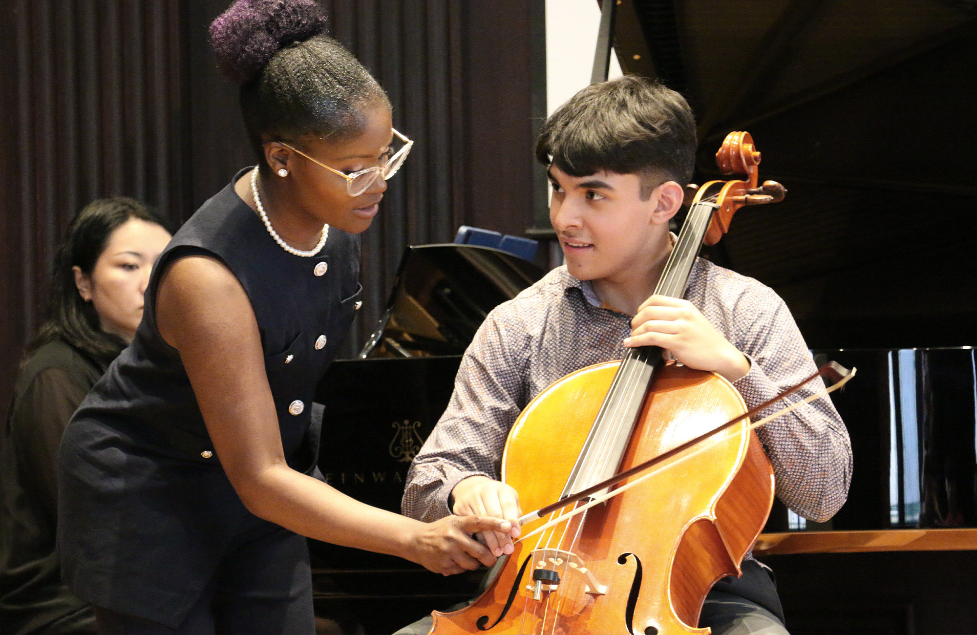 Associate Professor Patrice Jackson assists a student cellist with his bow grip.