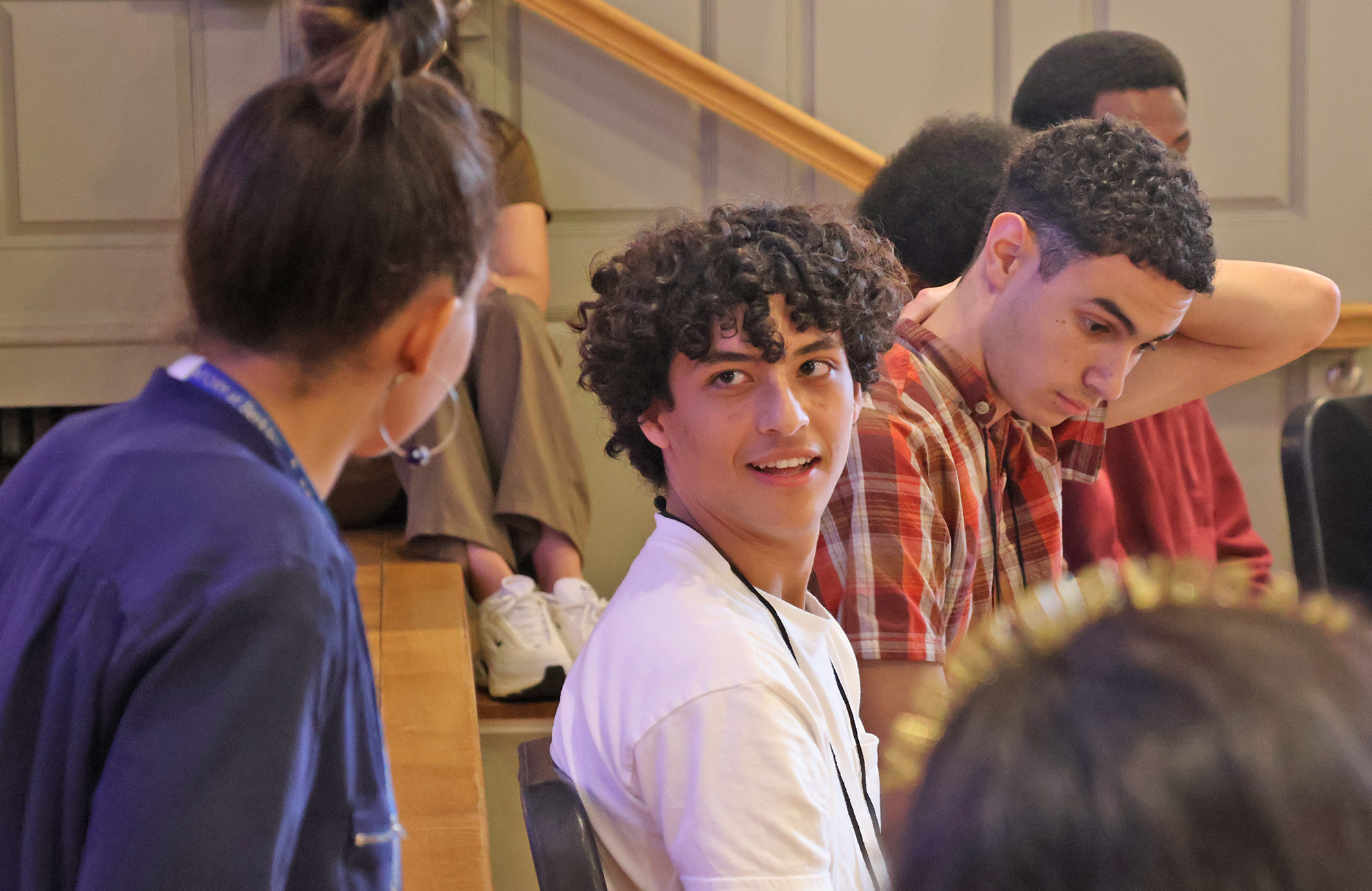 Natara Gray (left), assistant dean of admissions, speaks with academy students.