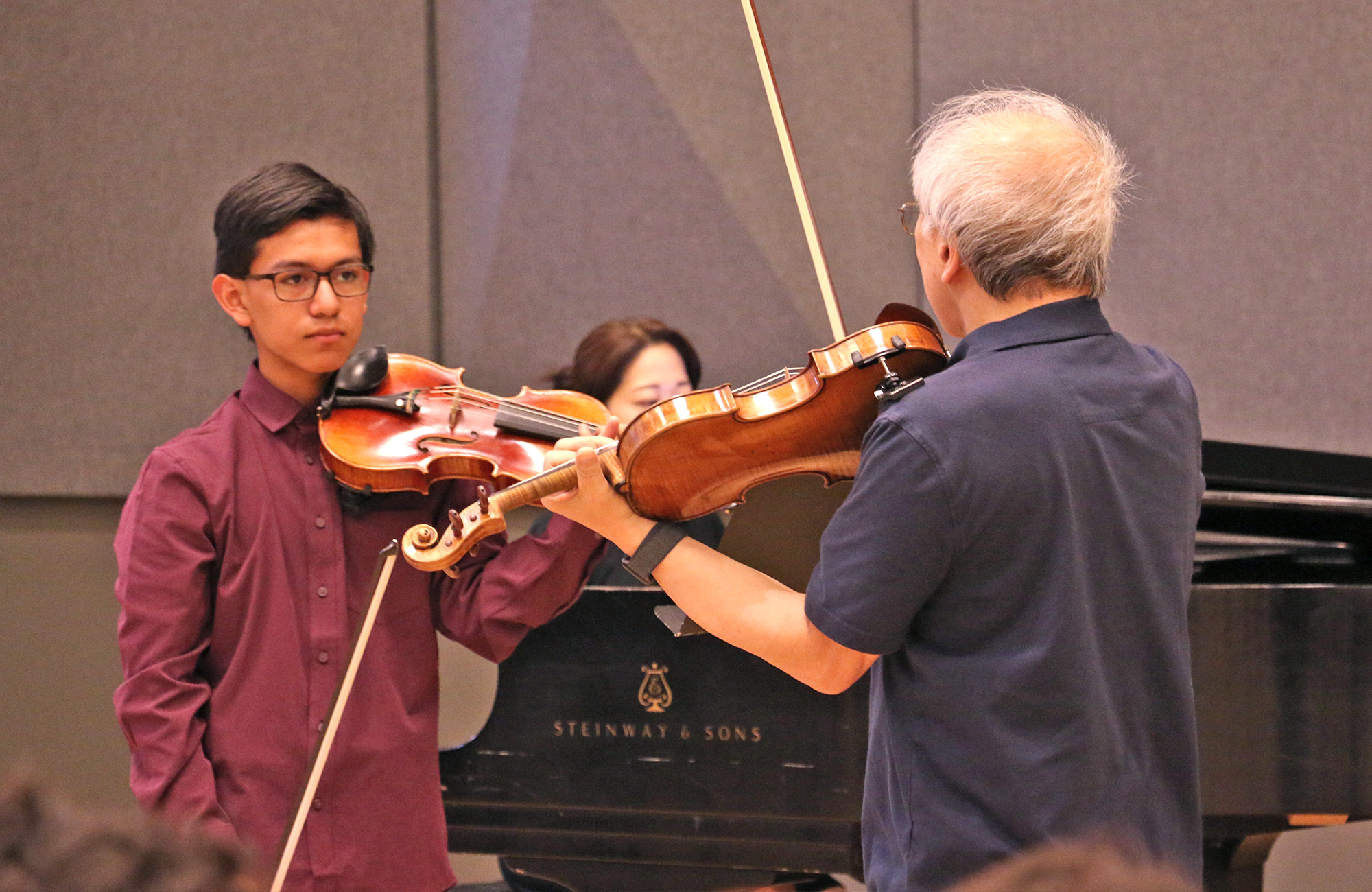 Professor Lynn Chang (right) works with a student violinist during a master class.