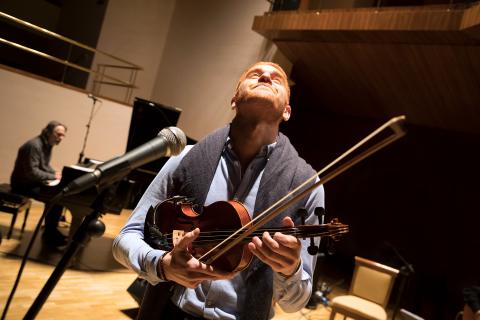 Spanish composer and guitarist Javier Limón and his Original Quartet (OQ)—with Indian vocalist Shilpa Ananth B.M. ‘13, Israeli flautist and vocalist Tali Rubinstein B.M. ‘14, and Iraqi-Jordanian violinist and vocalist Layth Sidiq B.M. ‘14 M.M. ‘16—led the show with a set of folk songs, some hundreds of years old but sharing a history as the roots of Mediterranean music—gypsy, Arabic, Sephardic, and Greco-Roman. Ananth, Rubinstein, and Sidiq all sang songs in their native languages, to enthusiastic applause.