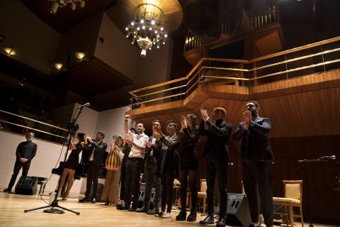 From left to right: Matthew Nicholl, Brigitte Sosa, guest pianist Alfonso Pérez, Aliya Cycon, Nella Rojas, Javier Limón, Javi Limón Jr., Shilpa Ananth, Tali Rubinstein, Layth Sidiq, and Israel "El Pirana" Suárez, at Madrid's National Auditorium.