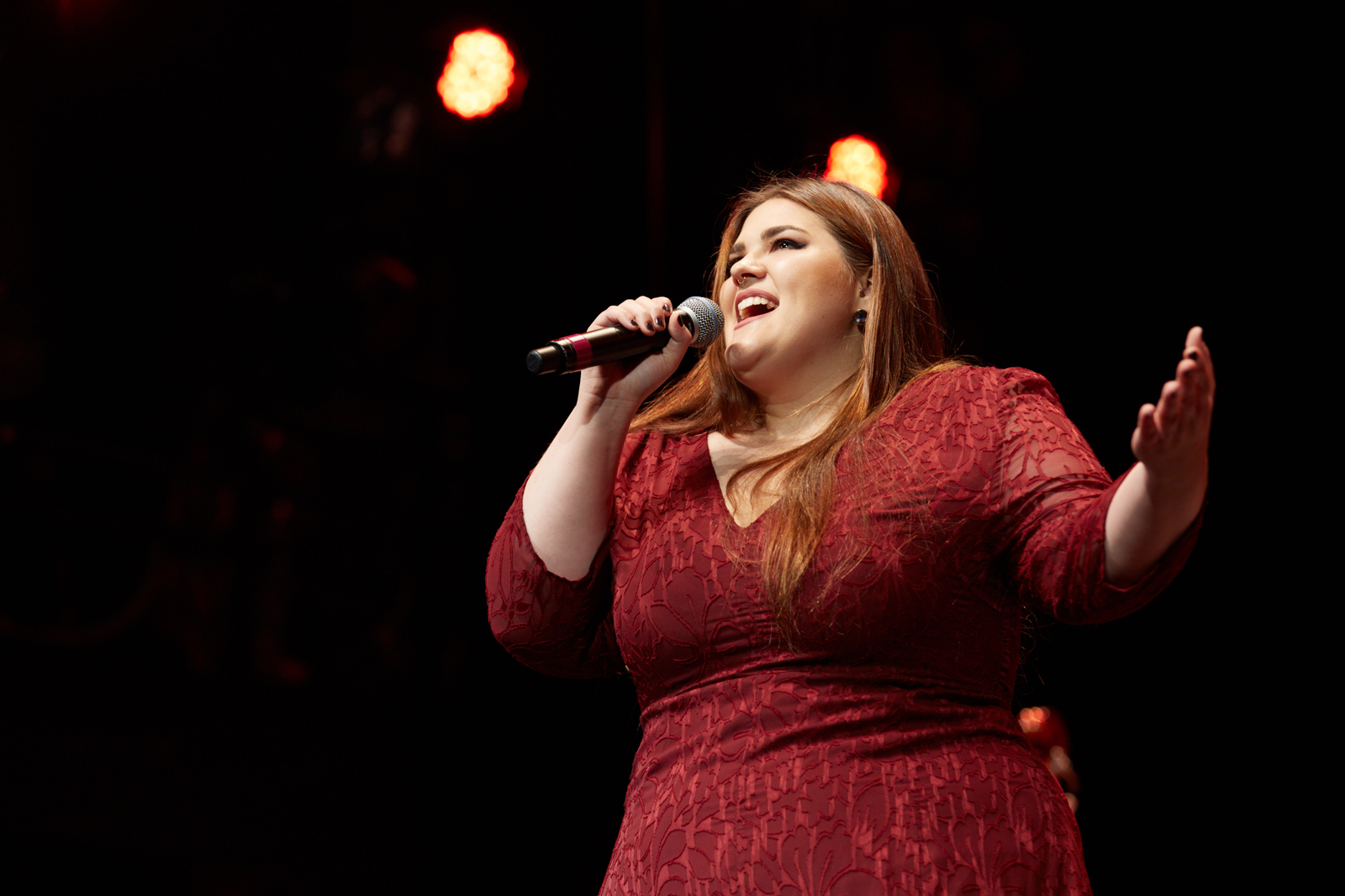 Vocalist Maria Alejandra Jimenéz, a Berklee student from Colombia, performs on stage. The concert displayed the traditions and styles of Colombia both through music and wardrobe.