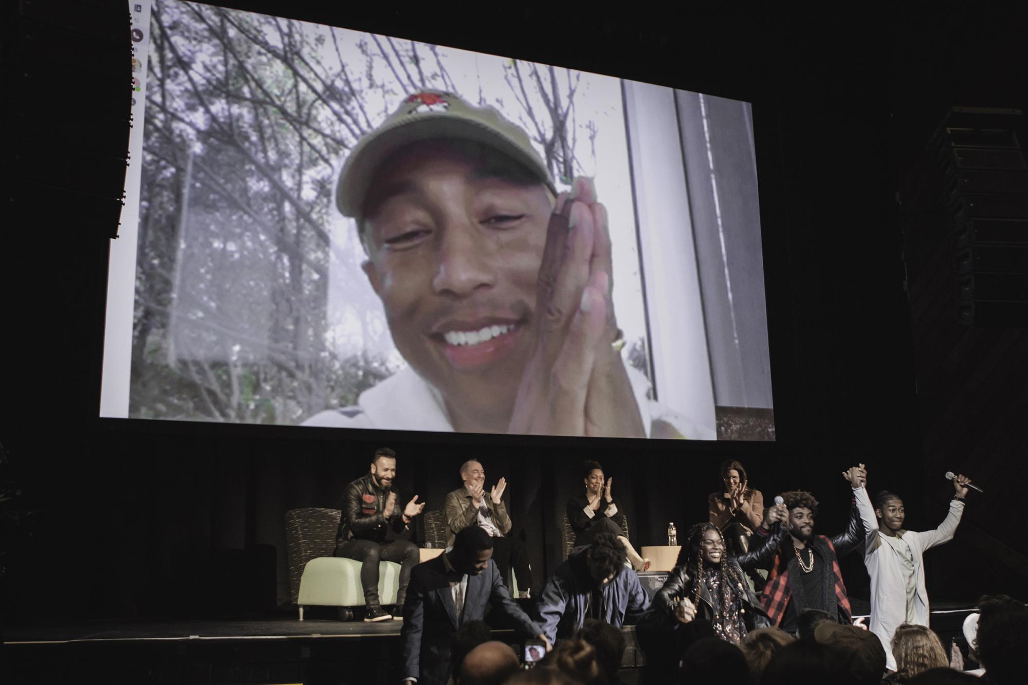 Keynote speaker, songwriter and producer Pharrell Williams connected via Skype to an audience gathered in the Berklee Performance Center. He felt inspired after Berklee students sang a mash-up of birthday songs to celebrate his birthday.