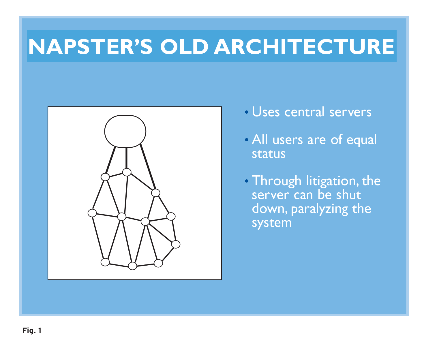 Internet antipiracy legislation was an effective tool in the days of Napster (see figs.1 and 2). Because Napster used a central server to process search requests and connect users to one another, the network could easily be shut down through legal judgment against those controlling the central server. Law enforcement in the current environment is now qualitatively more complicated. Fast Track, the software that powers KaZaA, resembles Napster in that it uses powerful computers to process individuals’ search requests. These powerful computers, or nodes, however, are not operated by the network. They belong to a vast nexus of independent users. Though lawsuits can be initiated against companies like KaZaA and damages sought, little can be done to shutter the system. By shedding their central servers, networks operating on the Fast Track architecture can only be shut down through continued litigation against traders whose computers become nodes on the network.