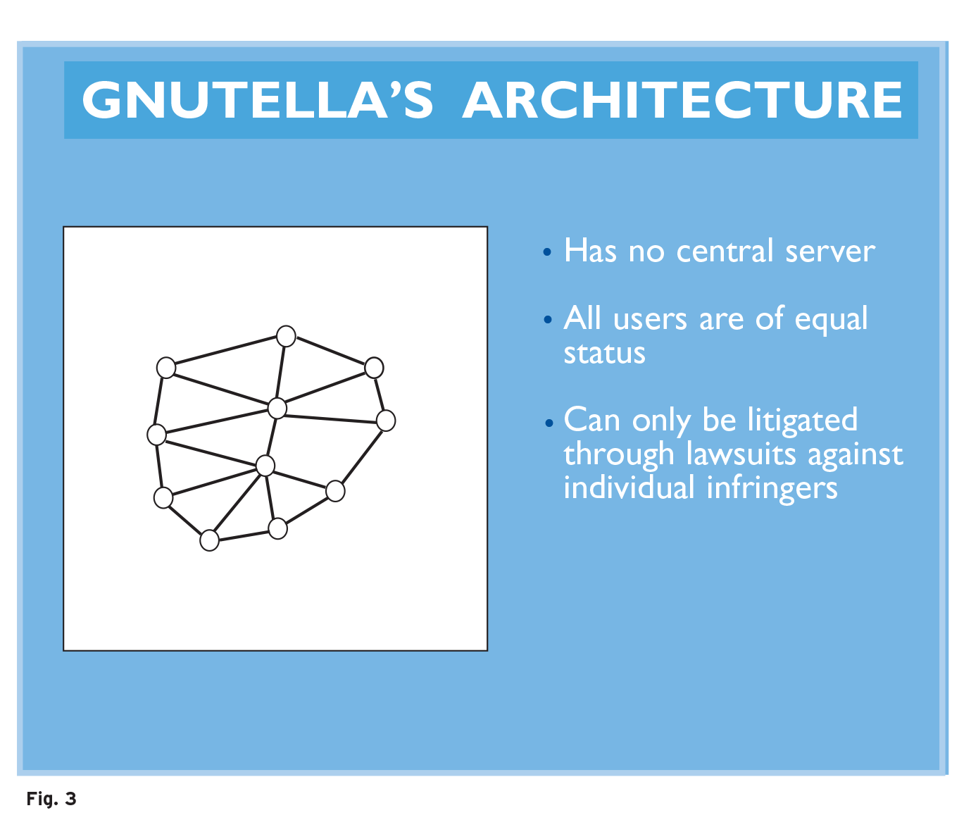 Litigation becomes nearly impossible in the completely decentralized and increasingly popular Gnutella environment. Gnutella (pronounced new-tell-ah) is an “open source” protocol (see fig. 3), that means it can be used and modified in any way that software manufacturers see fit. In practical terms, this implies that many networks powered by Gnutella exist only as chains of computers used by individual file traders without a central company to identify in a lawsuit. This decentralization is akin to a Pandora’s box: Once a network is created, it operates based on its own popularity and without a controlling hub. The only legal remedy for record labels, therefore, is to sue individual users.
