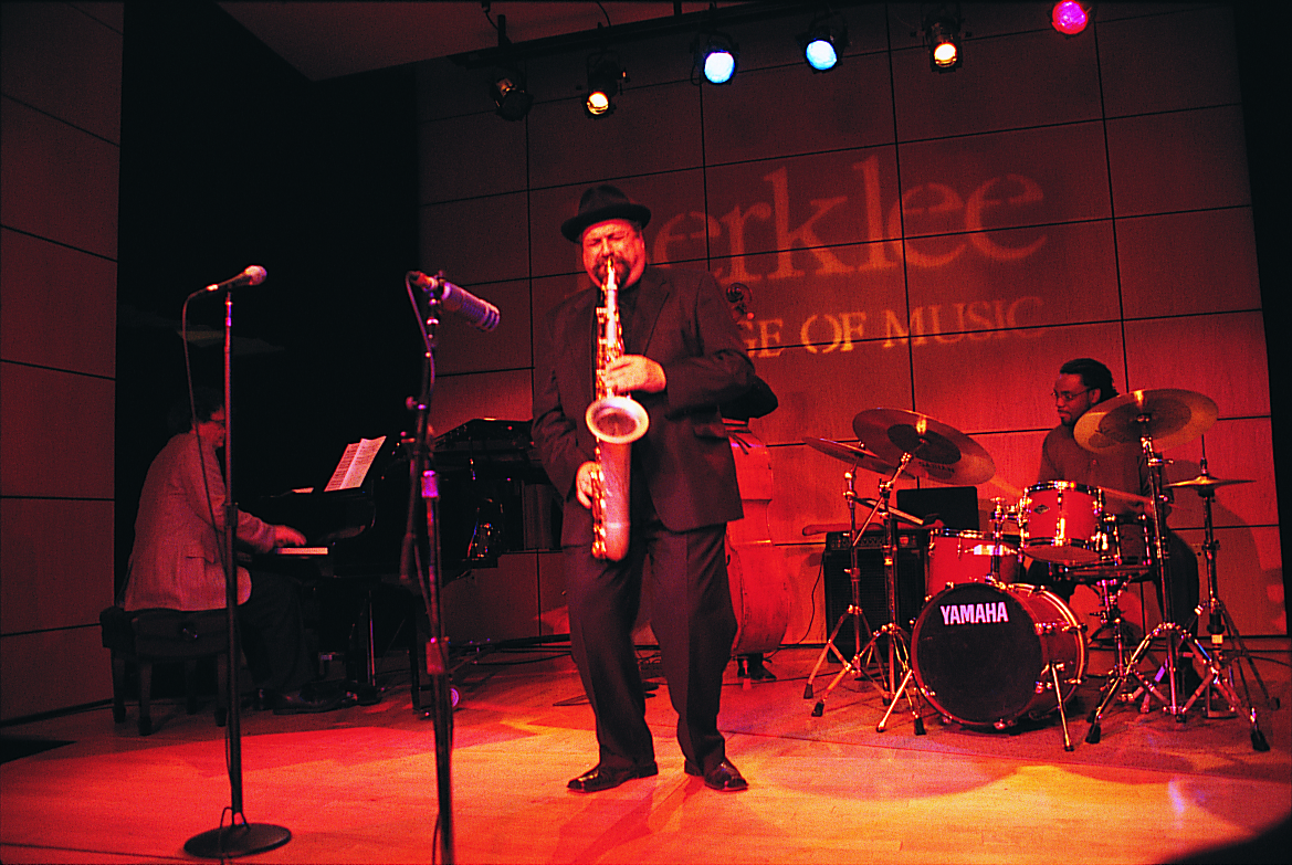 Saxophonist Joe Lovano ’72 played a concert for the Boston Berklee Alumni Chapter at the David Friend Recital hall in November 2001. He was backed by faculty members Laszlo Gardony ’85 on piano, Yoron Israel on drums, and John Lockwood ’77 on bass. Photo by Toni Ballard