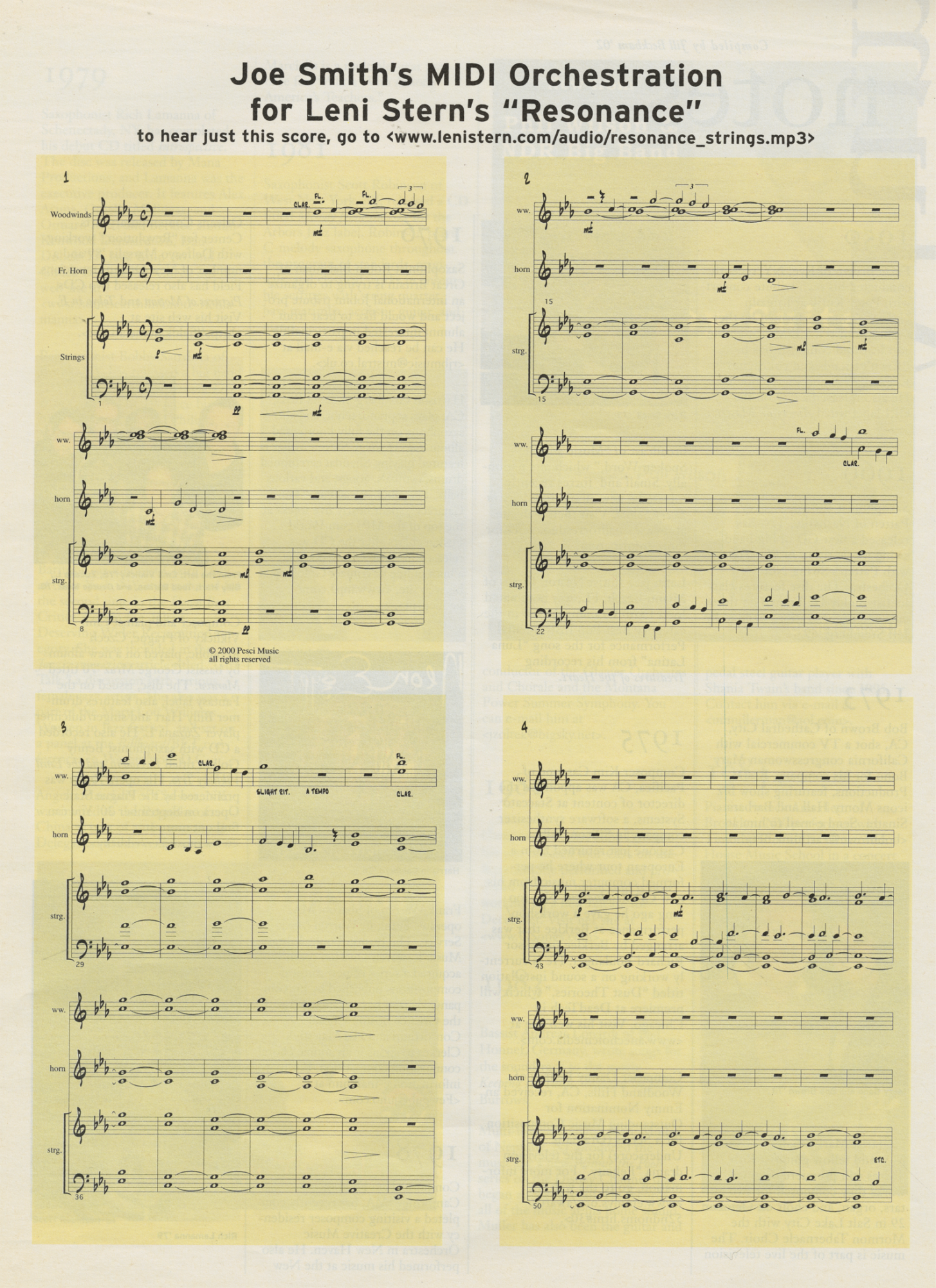 This article will focus on the final track of the CD, an instrumental improvisation entitled "Resonance." The instrumentation includes percussion, acoustic bass, electric guitar, and a MIDI orchestra consisting of strings, flute, clarinet, and French horn. [See the links to the MIDI score above.] To hear the score as you read along with this article, go to the web site at <www.lenistern.com/audio/resonance_strings.mp3>. Leni's homepage is at <www.lenistern.com>.