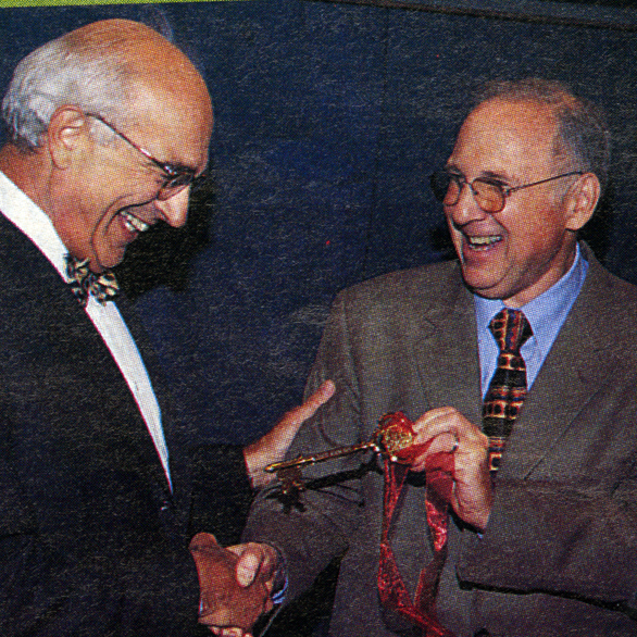 From the left: Former board of trustees chair Will Davis receives a commemorative key from President Lee Eliot Berk during the September 2001 dedication of the Will Davis room above the lobby of the Berklee Performance Center.