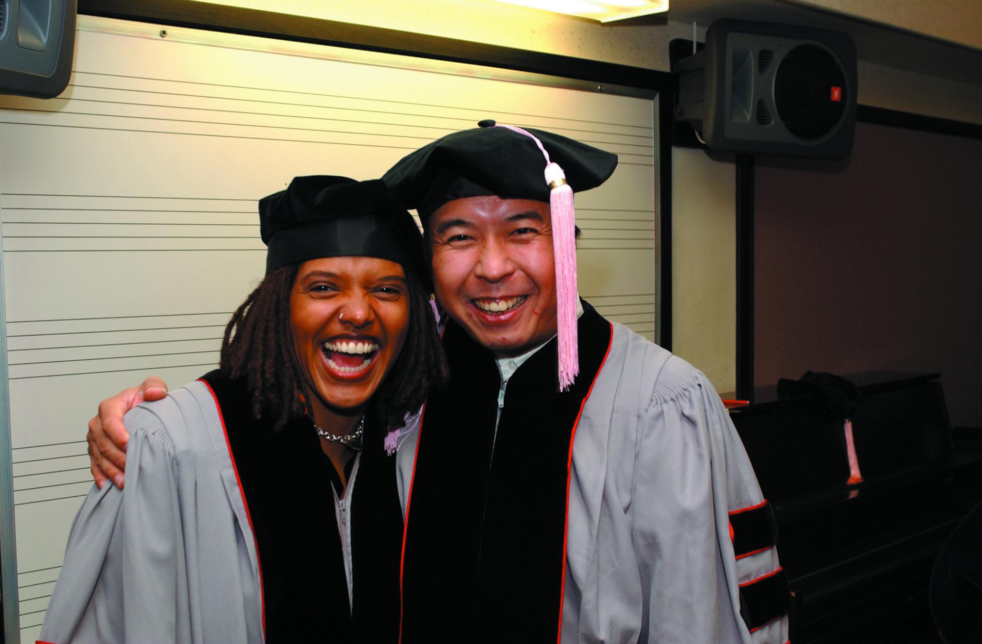 Honorary degree recipients Terri Lyne Carrington (left) and Makoto Ozone, former Berklee classmates, revel in the moment backstage before the September 5, 2003, Entering Student Convocation.