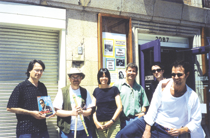 From the left: San Francisco alumni Stephen Vale ’80, Karen Kindig ’90, Associate Professor Jeff Baust, James Willetts ’00, and Zack Ferris ’95 outside the Jazzschool in Oakland following Baust’s July 27 clinic on Emagic’s Logic Audio software.