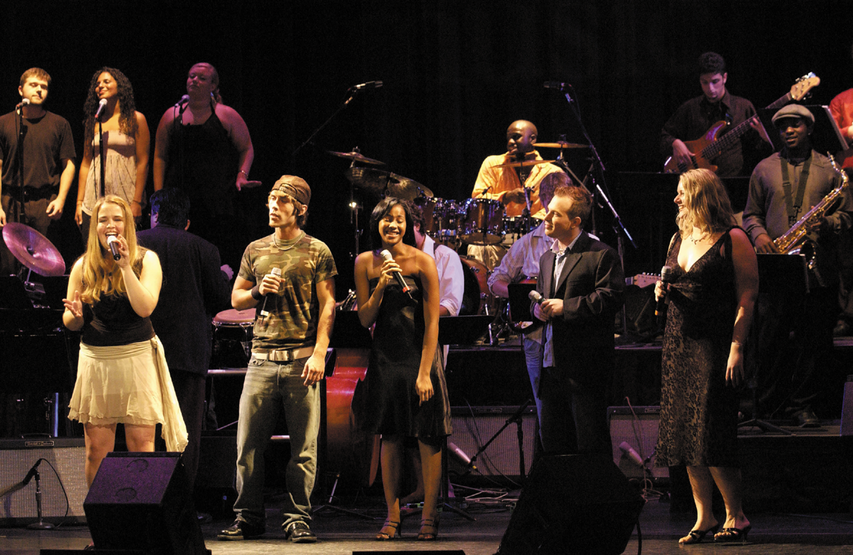 All singers on deck. (From the left): vocalists Evan Baughman, Andrew Douglass, Kamaria Ousley, Jeremy Ragsdale, and Sarah Johnson team up to sing "With a Little Help from My Friends" for the concert finale.