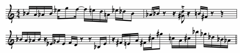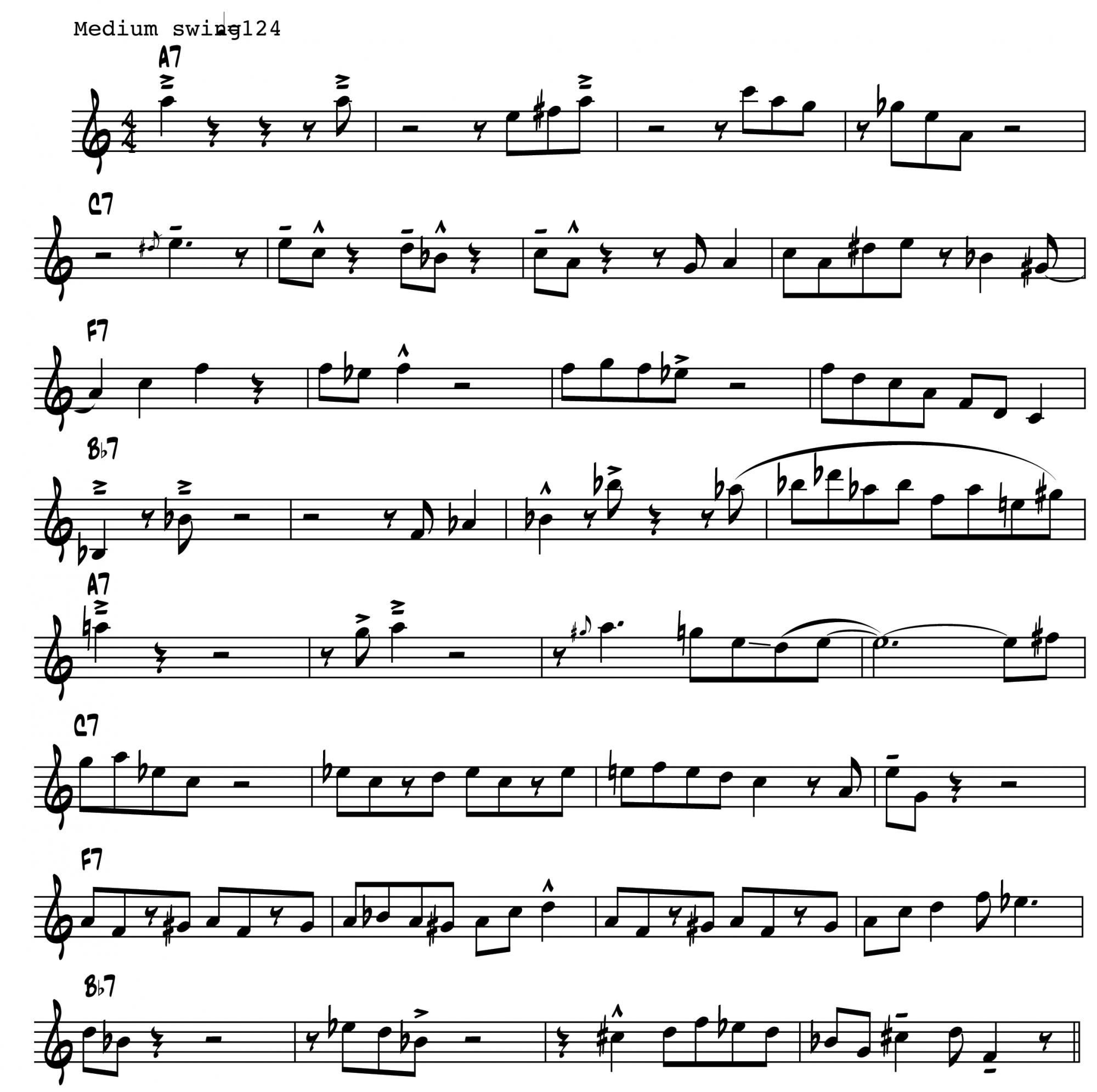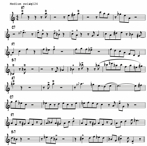 The next step involves thinking about organizational and fingering concepts on your instrument. For guitarists, this is probably the most difficult issue to solve. Traditionally, many reading-oriented guitar methods start at the lower end of the fingerboard using a mix of open and stopped strings. They then work gradually higher on the neck incorporating transposable blocks of fingerings using only stopped strings that lie in a certain region or position on the guitar neck. It makes sense to start at the bottom and work up in the beginning and the in-position scale fingerings are valuable for organizing ideas because they are transposable. But, using these approaches exclusively for reading on the guitar tends to compromise the quality of phrasing, especially with jazz music. I’ve seen many guitarists try to read a jazz transcription in one position or with badly organized fingerings and get poor results. Generally, most contemporary guitarists think diagonally and move up and down the strings in addition to using fragments from in-position concepts when making fingering choices. This yields a more hornlike quality (which is good for jazz lines) and phrasing that fits modern guitar styles.