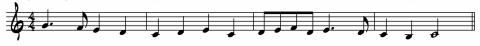 Regardless of our instrument or how and where we choose our fingerings, one has to start cataloging the musical content of pieces in order to access these components on-demand for reading. Let’s analyze the content of a few examples. The notes in example 4 are a fragment of the Christmas tune “Deck the Halls.” They are predominantly scalar and entirely diatonic to C major. On the guitar, this melody could be played in “open” position utilizing open strings in the lowest part of the neck or in higher positions with no open strings. It might even be played entirely on one string (the fifth or sixth string).