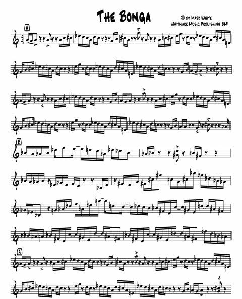 I’ll conclude with the entire chart of my tune “The Bonga.” This is an example of a piece that would be very difficult to sight-read cold. Go through the steps I’ve outlined here and try it in smaller chunks of, say, four bars at a time. Use a metronome to keep yourself honest. Start slowly then gradually speed up the tempo. You can listen to an audio file of “The Bonga” online at www.berklee.edu/bt/172/lesson.html and play along with the recording. You might consider using one of the many transcription software aids available that slow down the tempo without changing the pitch.