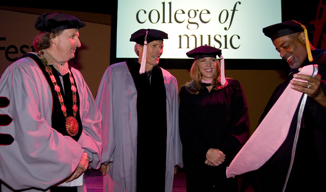 Clint Eastwood (second from left, flanked by Berklee President Roger H. Brown and Diana Krall ’83) looks at his doctoral collar held by Berklee VP Larry Simpson.