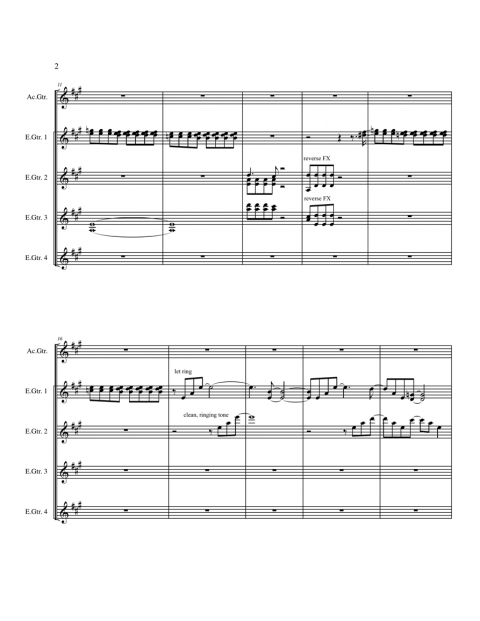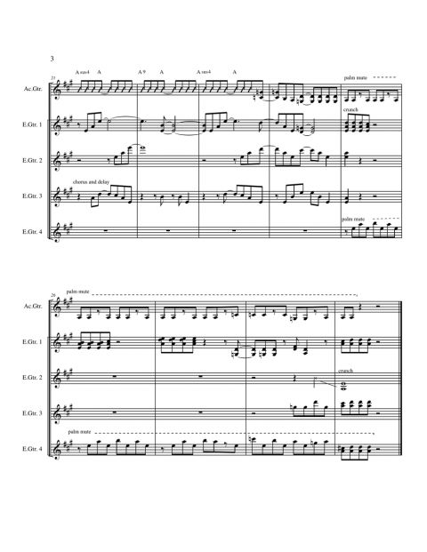I played palm-muted parts (also called “blunting”) on the acoustic guitar and electric guitar four in bars 25 to 29. This approach works with constant eighths or repeating patterns. I doubled the acoustic part and panned the tracks to the left and right. Electric guitar four has a higher-pitched pattern that alternates between an A and an E. These muted parts alone are nice—light and airy—and would make a good intro or middle section, especially if chords were to change below them.