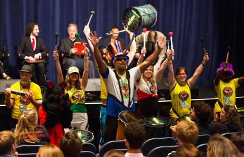 The opening of the August 30 entering student convocation was accompanied by a percussion ensemble in the aisles of the Berklee Performance Center.