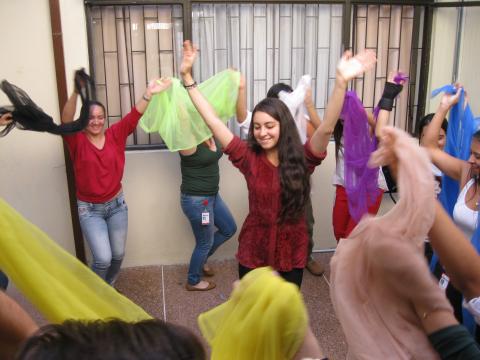 In one activity during the hour-long session, Villa and Roa led the game Tingo Tango (similar to wonderball) where a ball is passed around as music plays. The person holding the ball when the music stops draws from a pack of cards that poses simple questions, such as, “If you were to go to a desert island, what would you take with you?” One young girl said that she’d take only friends and family to the island while others mentioned a range of material items. Through further interactions, the participants began sharing with the group more personal insights regarding their lives. During a directed meditation as ambient music played, Villa calmly recited thoughts for all to ponder with their eyes closed. After more group singing to well-known songs, the session culminated with a scarf dance. Led by Villa, the participants danced gracefully waving their arms, the whole group linked together by holding opposite ends of chiffon scarves.