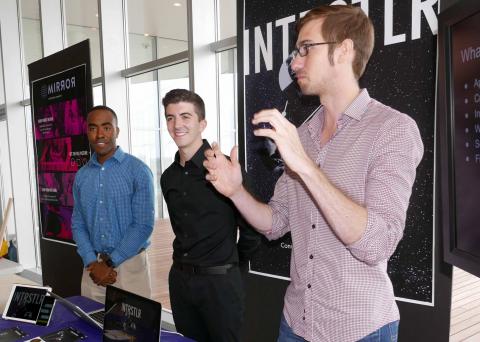 From the left: OMI fellows Joel Stevenson of the University of Baltimore and Berklee students Andrew Smith and Sebastian Barniol were among 18 fellows participating in OMI’s summer lab. They proposed an app called INTRSTLR to facilitate connections between fans and behind-the-scenes participants on recordings.