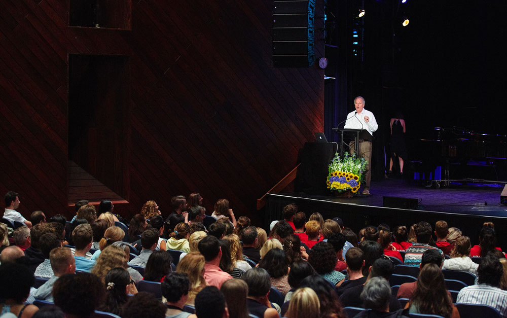 In his opening remarks, president Roger H. Brown gave a bit of the story of the entering class. He shared that the new students hail from 101 different countries with the largest number coming from China, followed by South Korea, Canada, Colombia, and Italy. The largest cohort of American students come from California, followed by those from Massachusetts, New York, and Florida. With enthusiasm, Brown announced, “For the first time in the history of the college, this class is made up of 42 percent women and the conservatory has more than 50 percent women. We’re going to have a lot of great female energy in this institution this year. We are really glad you’re here.”