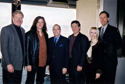From the left: Peter Gordon, Michael Thompson '75, Sandy Feldstein, Curt Sobel '78, Leanne Summers '88, and David McKay at the January 21 Los Angeles alumni brunch.