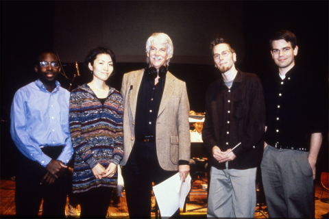 Trekkies for a Day: Composer Jay Chattaway (center) flanked by students (left to right) Brian Simmons, Aiko Fukushima, Christopher Dierks, and Michael Goodenow at the conclusion of a mock "Star Trek" scoring session in the Berklee Performance Center
