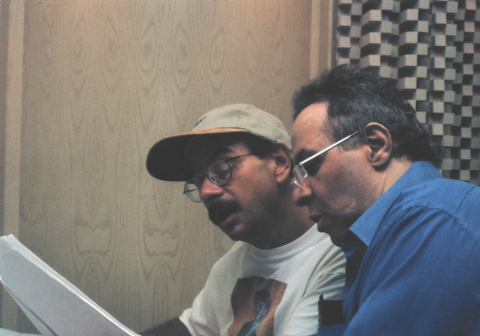 Bobby Vince Paunetto '73(right) goes over his score with bassist Mike Richmond during a recording session for Paunetto's Commit to Memory CD