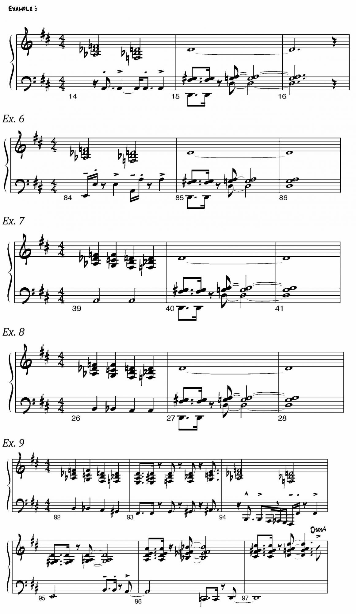 This same harmonic device, in a slightly developed form, is the basis of the changes for the sax solo later in the piece. The harmony now moves to the relative minor key, and several quartal structures move above a bass line outlining B minor/blues (see example 2).