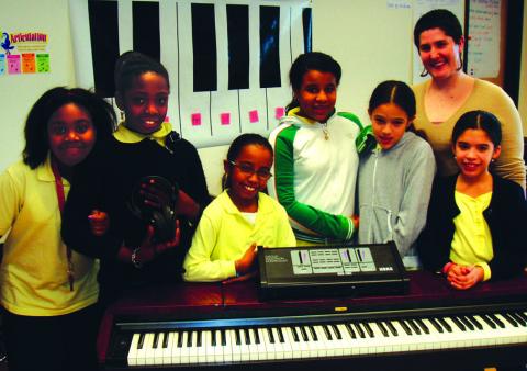 Front row from the left: Students Akeylah McTaggart, Amira Nwokeji-Iwuala, Tayler Fernandes, Sara Arias, Kimberley Gonzales, and Marcel Baez, and teacher Shelley Irvin (back row) pose with Korg keyboard equipment at the Orchard Gardens K-8 Pilot School.
