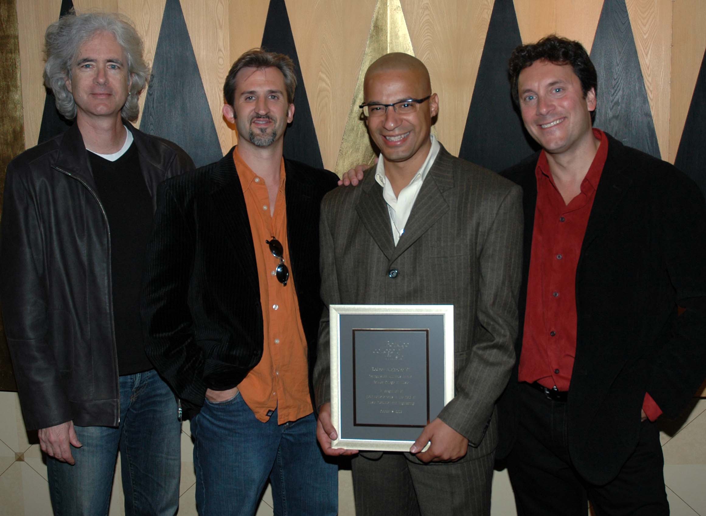 From the left: Berklee’s Music Technology Dean Stephen Croes, MP&E Assistant Chair Dan Thompson ’94, distinguished alumni award recipient Rodney Alejandro ’97, and MP&E Chair Rob Jaczko ’83 at the December alumni reception in San Francisco.