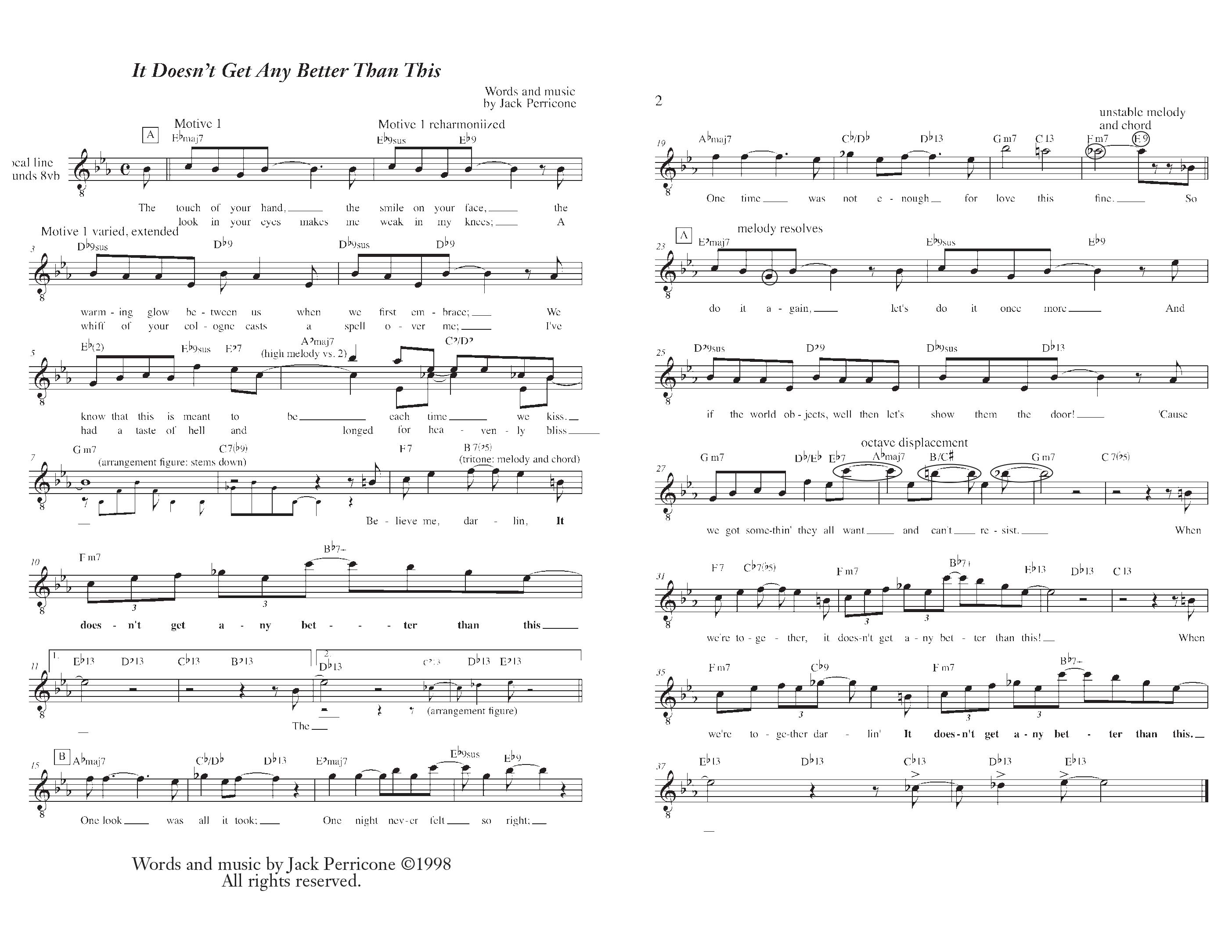 Ideas for a song can come from many sources. I wrote a jazz song, “It Doesn’t Get Any Better Than This,” based on the title, which came to me because of a happy accident. I’d seen the movie As Good as It Gets, starring Jack Nicholson, and inaccurately remembered the title as “It Doesn’t Get Any Better Than This”—a title that’s as good as it gets! Beginning the songwriting process with a title often prompts a writer to consider the circumstance or context in which the title phrase should occur. In this case, I began thinking of elements that make a romantic relationship work. I made a list of elements—“the touch of your hand,” “the smile on your face,” “the warming glow between us when we first embrace”—that led naturally to the title, which is also the concluding line.