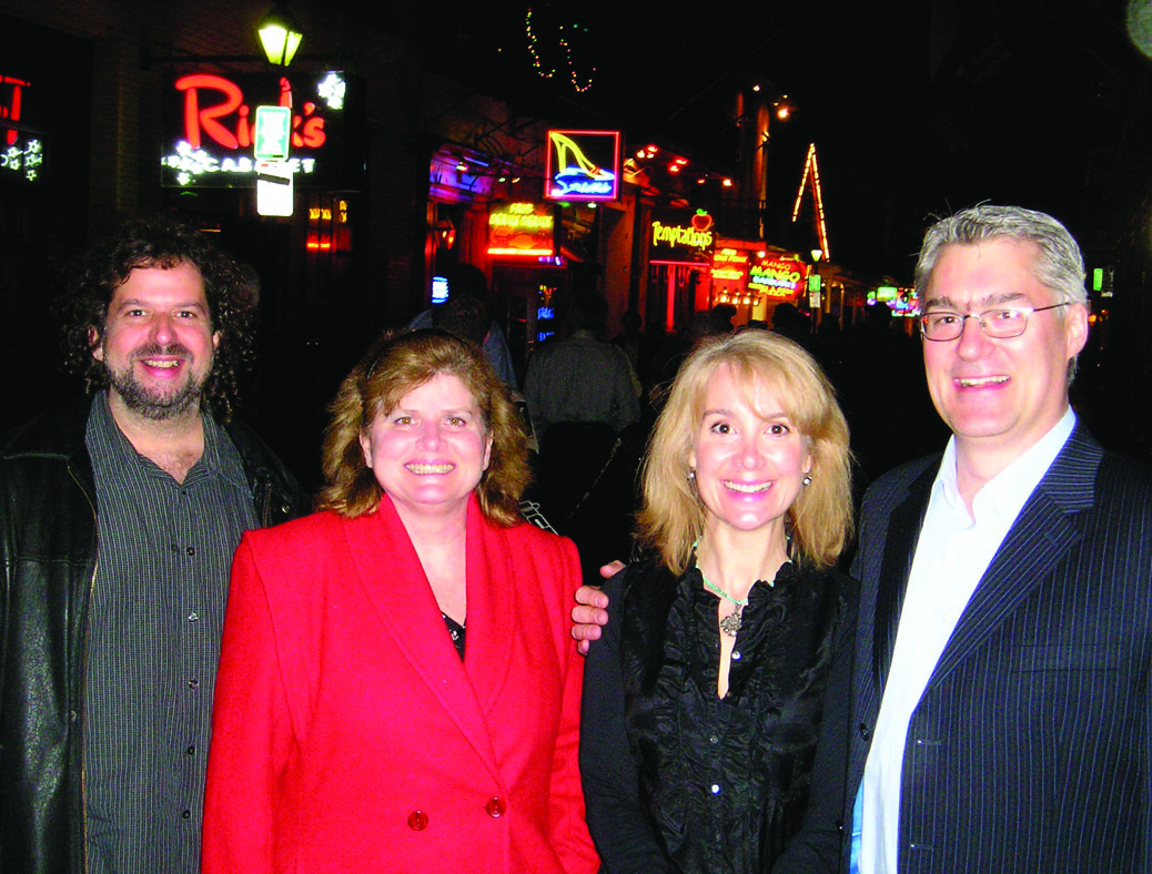 From the left: Bert Cotton ’89, Carol Evans ’83, Jennifer Atkins and Victor Atkins ’90 pictured on Bourbon Street after an alumni gathering in February in New Orleans.