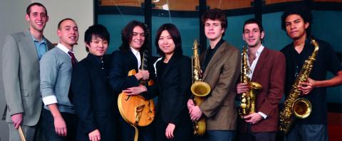 From the left: Joey Lefitz, Paulo Stagnaro, Takeshi Ohbayashi, Kenji Herbert, Jeonglim Yang, Jesse Scheinin, Eyal Shmuel Hai, and Jahaziel Arrocha, consitute the Berklee Global Jazz Institute Octet.