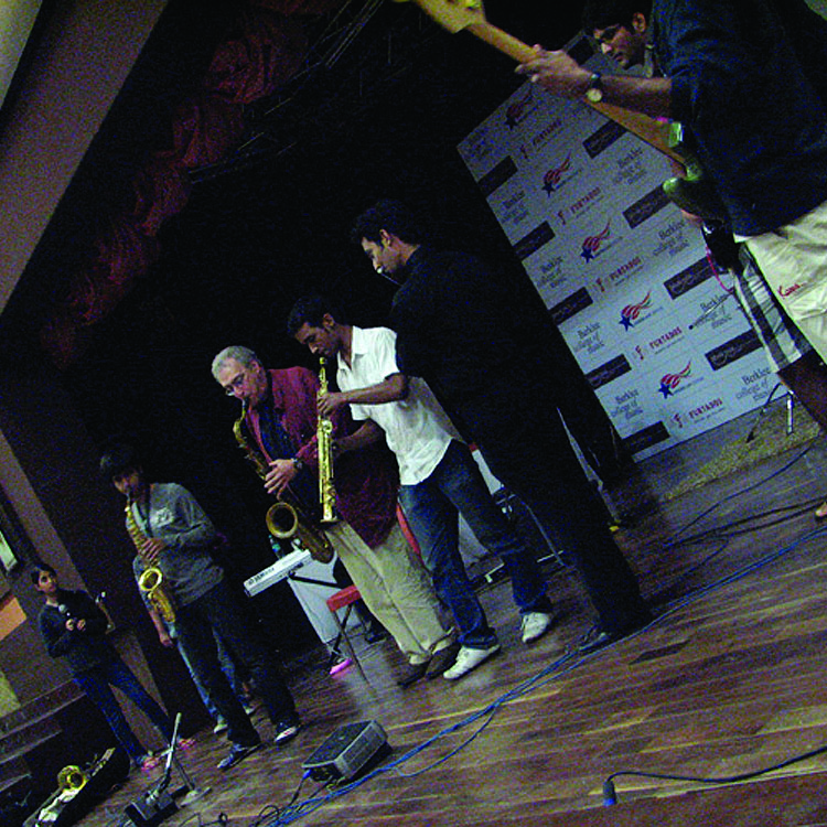 In February a team of Berklee faculty and staff members made visits to New Delhi and Mumbai, India. In each location, the team conducted clinics, master classes, and auditions. At Jack Thomas’s Performers Collective in New Delhi, we reconnected with numerous Berklee alumni during a reception at a local venue. In Mumbai, Satya Hinduja ’04 and the Jamnabai Narsee School hosted a series of events that drew overwhelming response. The clinics were packed and the days were booked solid with auditions for musicians aspiring to attend Berklee.