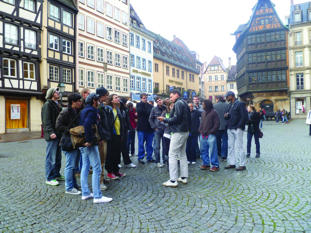 Berklee’s semester-abroad students shown at the start of a tour of their new hometown in Freiburg, Germany. A total of 16 Berklee students participated in the program at the International College of Music Freiburg.