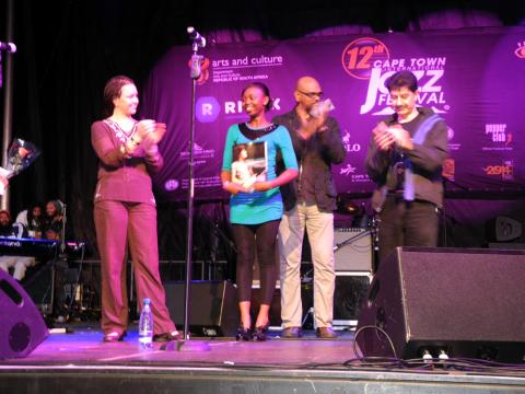 From left: Berklee Associate Professor Winnie Dahlgren, Adelia Douw, Berklee’s Assistant Director of Educational Programs Sam Skau, and Professor John Baboian. While in Capetown, South Africa, the Berklee team presented a Five-Week Summer Performance Program scholarship to Capetown native Douw at the Cape Town International Jazz Festival