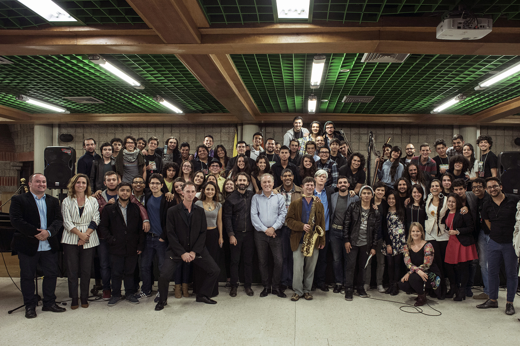 Students, instructors, and staff members gather for a final group photo at the 2014 Berklee Latino: Bogotá: Contemporary Performance and Production Program in Bogotá, Colombia. (Office of Global Initiatives)
