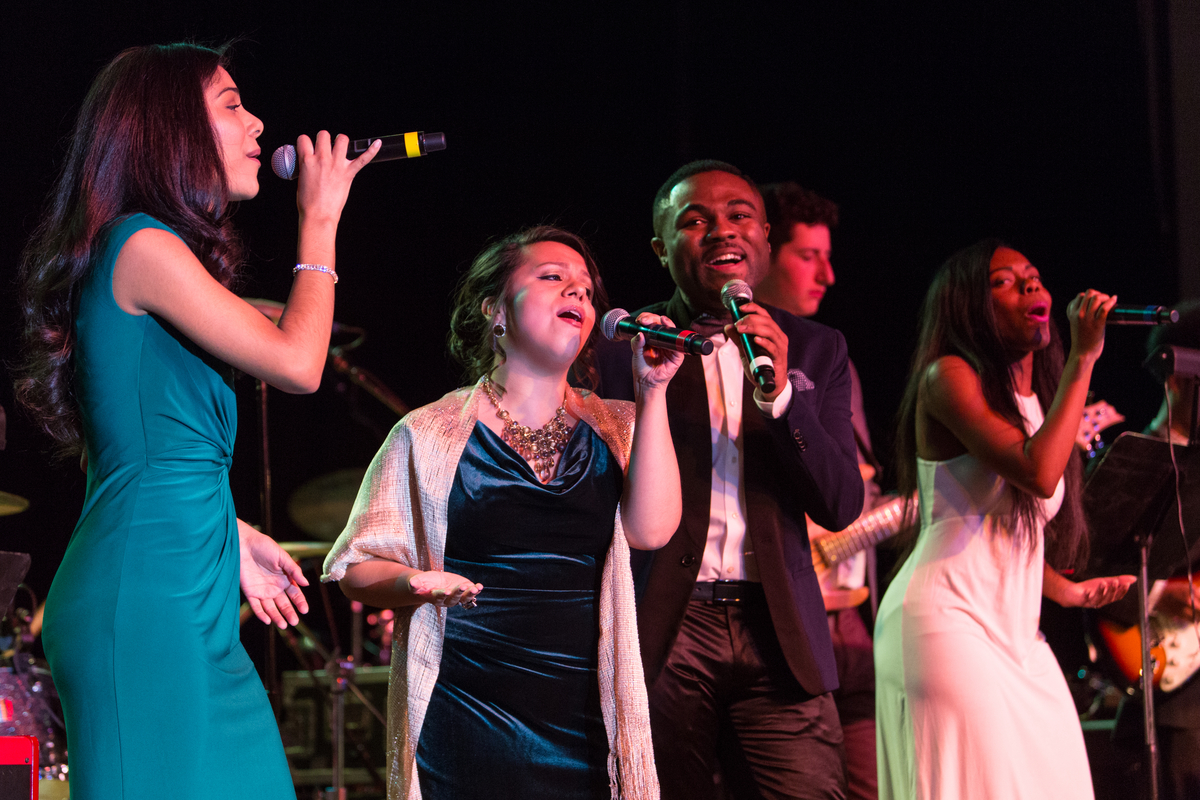 CIty Music student musicians (from left): Denisse Torres, Gabriella Cabezas, Robert Gould, bassist Daniel Winshall, and Brianna Washington perform “That’s What Friends Are For.”