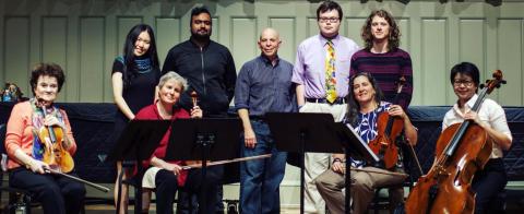 Front row, from the left: Esterhazy Quartet members Eva Szekely, Juile Rosenfeld, Leslie Perna, and Eli Lara. Back row: Student composers Sarah Chong Kar Ann and Nikhil Singh, professor Andrew List, and students Matt Scutchfield and Jordan Kerr.