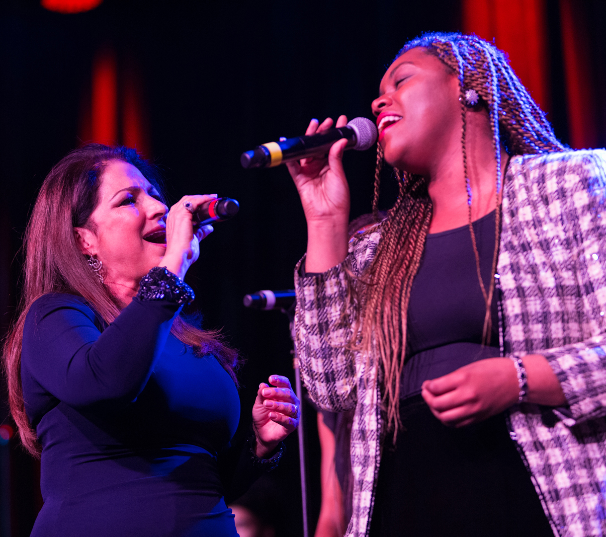 Grammy-winning vocalist Gloria Estefan (left), performs with Shania Wilcox, a student musician in the Berklee City Music All-Stars.