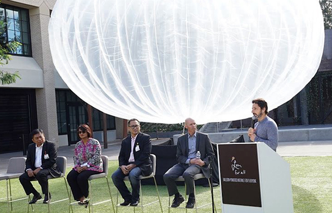 Google cofounder Sergey Bin (right) and Mike Cassidy (second from the right) together with the leaders of Indonesia's top three telecommunications companies announce a Project Loon pilot test in Indonesia.