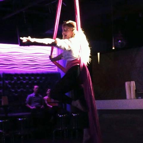 Sosnoski’s aerial shows are much more strenuous than a gig at the Bluebird Café or Douglas Corner. “It takes a lot of stamina not to huff and puff through a song when you’re trying to climb a strip of nylon,” Sosnoski says. “It’s tough. I’ve learned that there are some moves on the silks that I cannot do while singing because the wraps pull too tightly around my stomach. But I’m figuring it out.”
