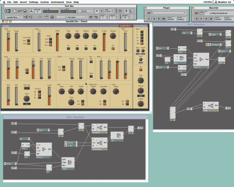 Figure 6: A subtractive synth created in Reaktor. One page shows the main interface, and two windows show how modules are connected together.