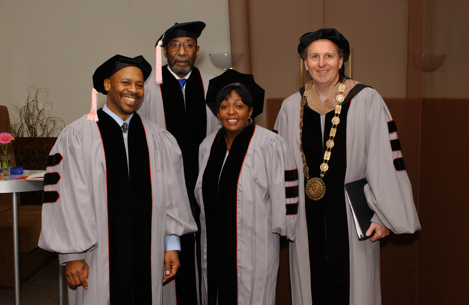 (From the left): Commencement honorees Kevin Eubanks, Ron Carter, and Anita Baker with President Roger Brown before the May 7 ceremony.