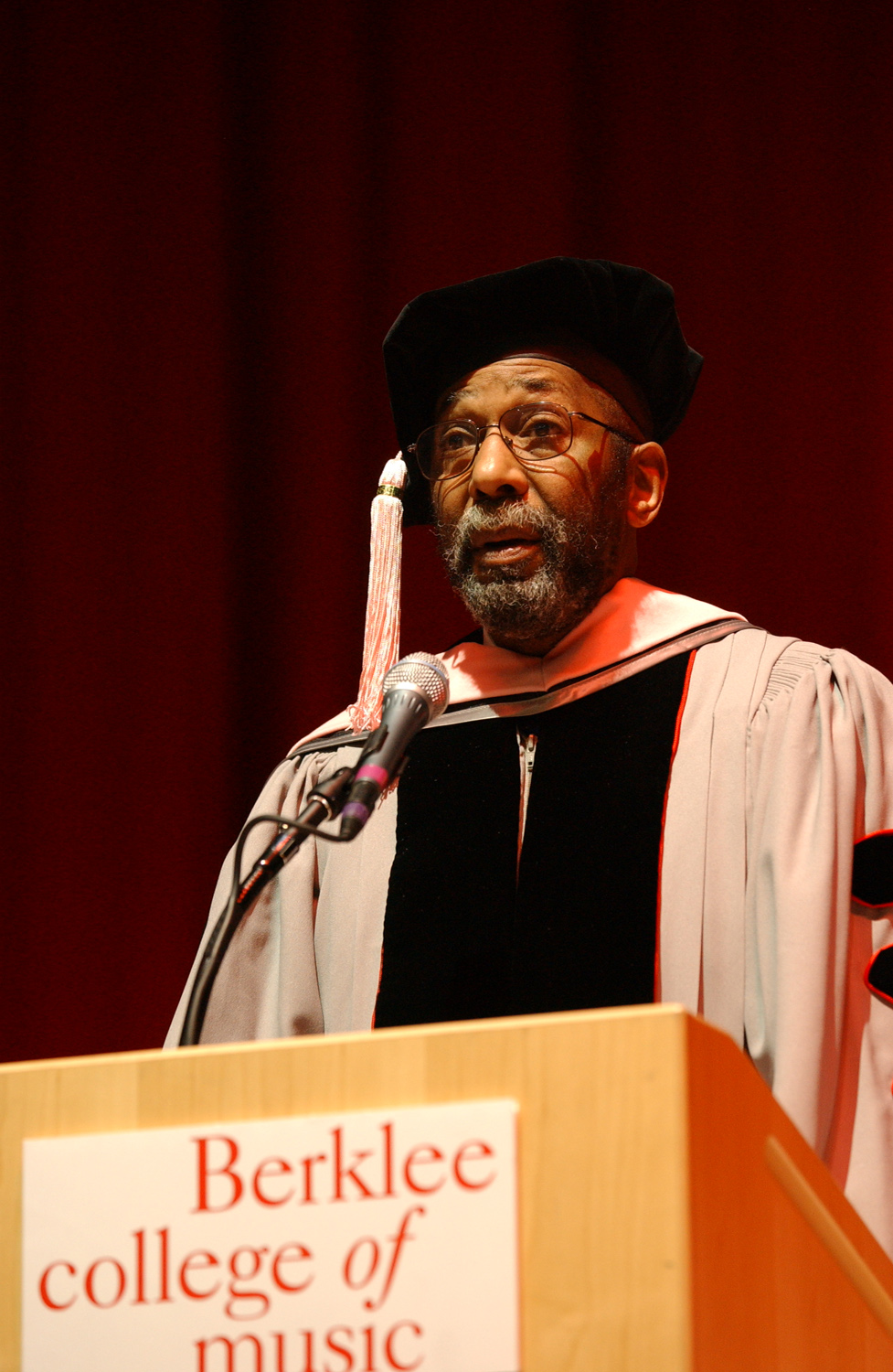 Brown gave a personal aside in his introduction of Kevin Eubanks. "Kevin's music was the bridge that first connected me to Berklee in 1986," said Brown, a drummer. "When I heard Kevin's album The Guitarist, I was completely blown away by the music-especially the drumming of Tommy Campbell." Brown later made his first trip to Berklee to seek lessons from Campbell who was then a faculty member. After the honoree presentation, Ron Carter gave the commencement address. He advised the grads not to let their emotions get in the way of the music. "People who think that music requires great passion are wrong," Carter said. "Of course music communicates passion and can move us to extreme emotions; but to be a good player, you better be calm, cool, and collected."