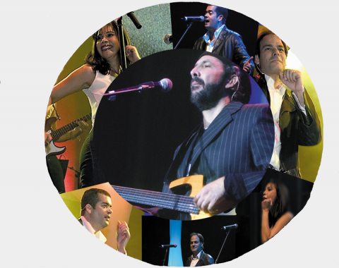 Juan Luis Guerra and vocalists Adalgisa Pantaleón, Roger Zayas-Bazán, and Quico Rizek of his famed group 4.40